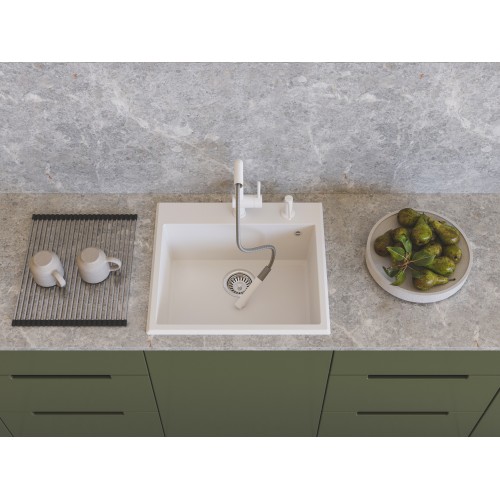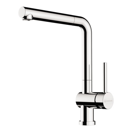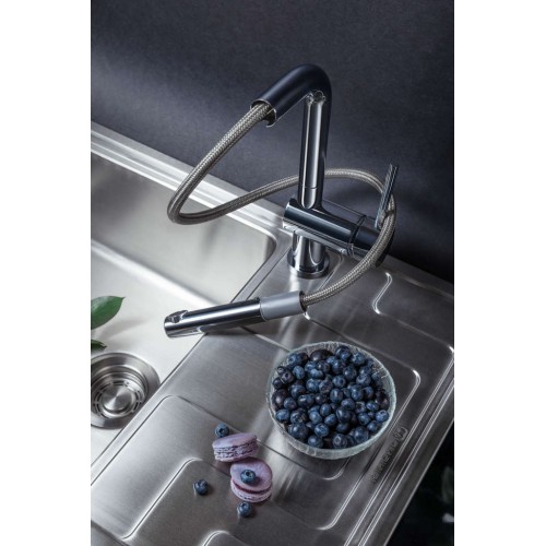 Практичный однорычажный смеситель выполнен в современном стиле и снабжен высоким поворотным изливом и вытяжным шлангом.