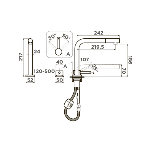 Рычаг регулировки температуры и напора воды вынесен отдельно и может быть установлен в любом месте рядом со смесителем.